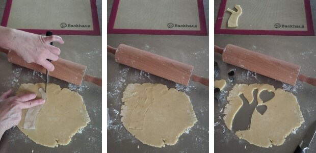 – Legen Sie die Schablone des auf Backpapier gezeichneten Stamms (die beschriebene Seite darf nicht in Kontakt mit dem Teig kommen) auf den ausgerollten Mürbeteig von etwa 3 mm Dicke und schneiden Sie ihn aus. Schneiden Sie auch die Herzen in verschiedenen Größen aus.