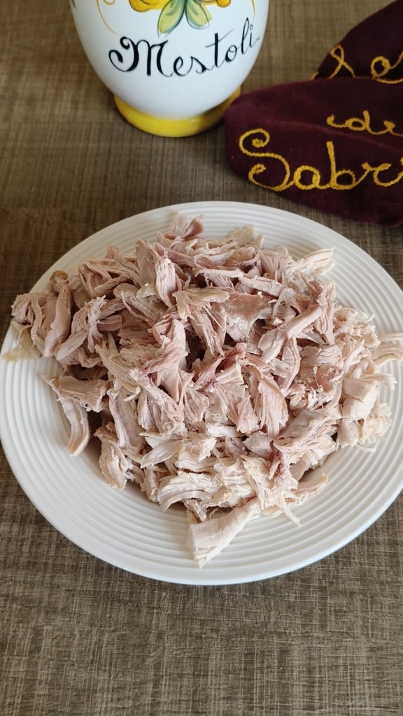 Das kalte Truthahnfleisch zupfen und eventuelle Fettreste entfernen.