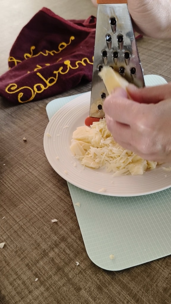 Den Caciocavallo mit einer Reibe mit großen Löchern reiben.