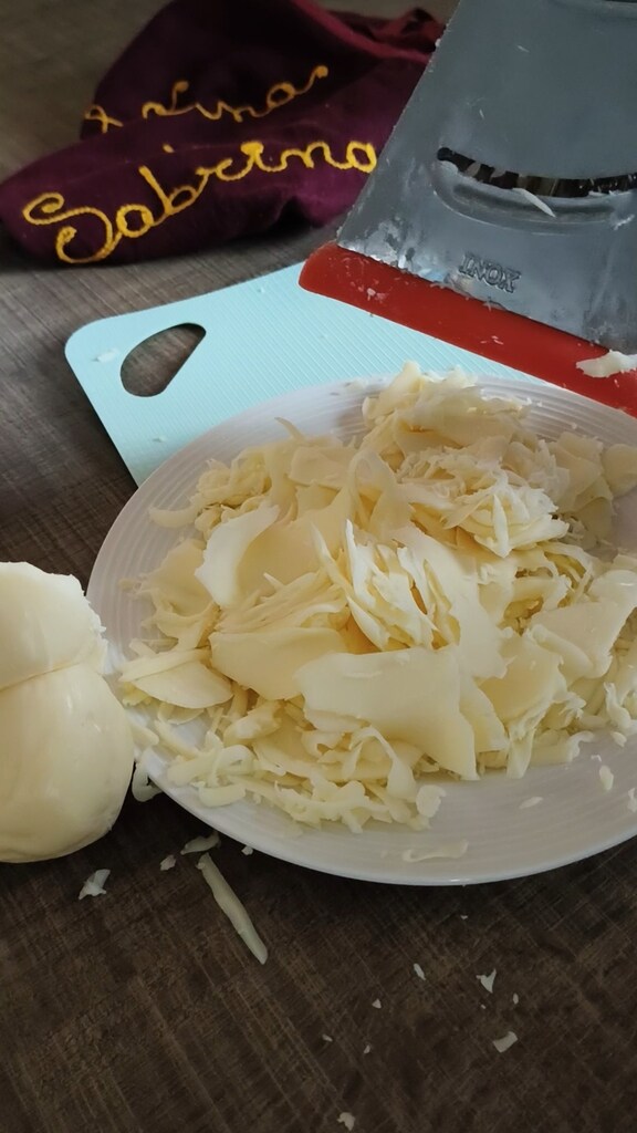 Die gereifte Scamorza reiben oder in dünne Scheiben schneiden.