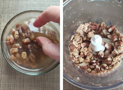 – Die Rosinen für ca. 15 Minuten einweichen, dann abspülen und gut trocken tupfen. (Wenn Sie sie nicht einweichen möchten, spülen Sie sie trotzdem ab und trocknen Sie sie dann.) – Die Nüsse grob hacken.