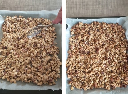 – Die Granola auf ein mit Backpapier ausgelegtes Backblech geben und im vorgeheizten Ofen ca. 20 Minuten backen. Sie sollte leicht bräunen. Den Ofen ausschalten und mit leicht geöffneter Tür 10 Minuten im Ofen lassen. Dann herausnehmen, komplett abkühlen lassen und in Glasbehälter füllen