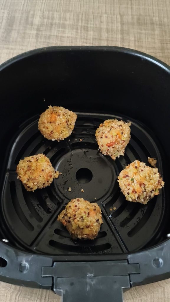 Das Rezept ist einfach: den Quinoa kochen, das Gemüse zusammen mit den getrockneten Tomaten zerkleinern, alles mit Semmelbröseln und Kräutern vermengen und die Frikadellen formen. Das Backen im Ofen oder in der Heißluftfritteuse macht sie leicht, aber außen knusprig und innen weich.