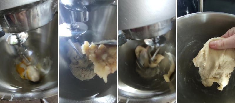 Sobald Sie sehen, dass die Küchenmaschine Schwierigkeiten hat, sich zu drehen, fügen Sie das Ei, den Zucker und das restliche Mehl hinzu.