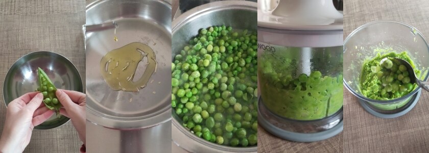 • – Erbsen auslösen, unter fließendem Wasser abspülen und dann in einem Topf in etwas Öl und gefriergetrockneter (oder fein gehackter frischer) Zwiebel garen. Etwa 15/20 Minuten kochen, dann pürieren, außer 2 Esslöffel, die wir hinzufügen, sobald eine grobe Masse erreicht ist.