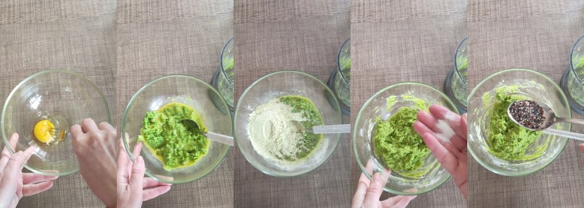 • – In einer Schüssel ein Ei mit einer Prise Pfeffer schlagen; die Erbsen (das Püree gemischt mit den ganzen) hinzufügen, das Mehl hinzufügen, mit einer Prise Salz und einem Esslöffel gemischten Samen würzen. Alles vermengen.