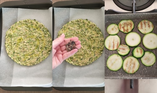 – Mit Hilfe eines flachen Tellers oder eines Tortenrings eine runde Form geben, mit Öl beträufeln und mit gemischten Samen bestreuen. Während es bei 180°C etwa 10/12′ gart, eine kleine Zucchini grillen und beiseite stellen.
