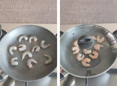– Die Garnelen in der Pfanne mit einem Esslöffel Öl ein paar Minuten pro Seite anbraten (mit Deckel abdecken, nachdem sie gewendet wurden) und beiseite stellen.