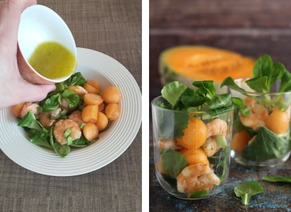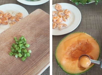 Sehen wir uns in wenigen und einfachen Schritten an, wie man den leckeren Garnelen- und Melonensalat zubereitet.