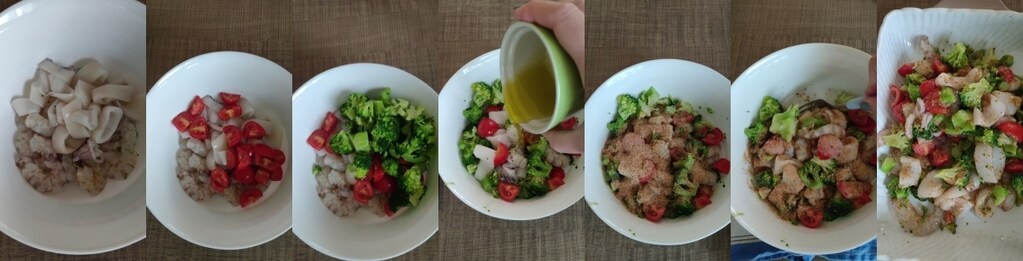 – Die Tomaten waschen und halbieren oder vierteln (nach Belieben) und in die Schüssel zu den Fischen geben; auch die Brokkoli hinzufügen und bei Bedarf leicht salzen.