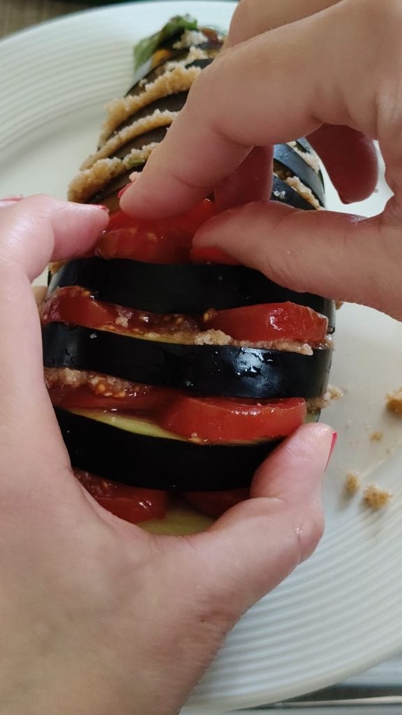 Die Auberginen zwischen den Scheiben mit der Teff-Creme füllen.