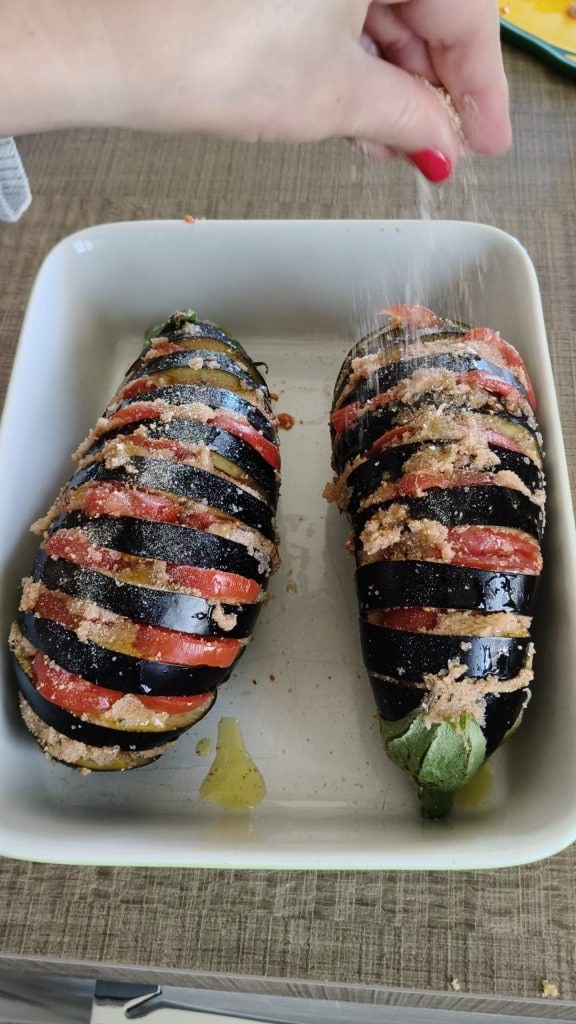 Ich habe mich entschieden, die Auberginen im Ofen zu garen, aber wenn Sie Platz haben oder es vorziehen, können Sie auch die Heißluftfritteuse verwenden.