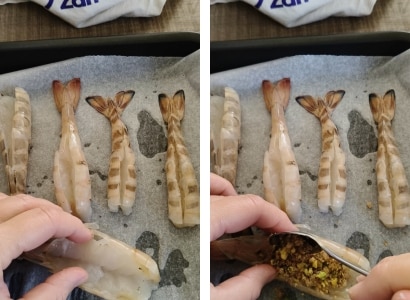 Grundsätzlich benötigt man nur 3 Zutaten, um das Rezept umzusetzen: die Garnelen, natürlich, Pistazien und Semmelbrösel. Aber für ein hervorragendes Gelingen, und das sage ich aus Erfahrung, müssen die Garnelen groß sein, weil sie dann leichter zu reinigen und zu füllen sind.