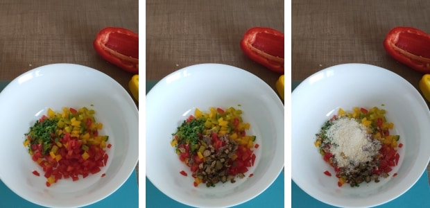 – In einer Schüssel die Paprikawürfel, gehackte Petersilie, Oliven, Kapern und Sardellenstücke zusammenbringen. Auch den Parmigiano hinzufügen, bis auf einen Löffel, der zum Überbacken benötigt wird.