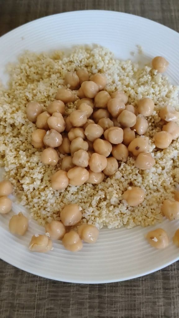 Die Hirse abgießen und mit den gut abgespülten und abgetropften Kichererbsen vermischen.