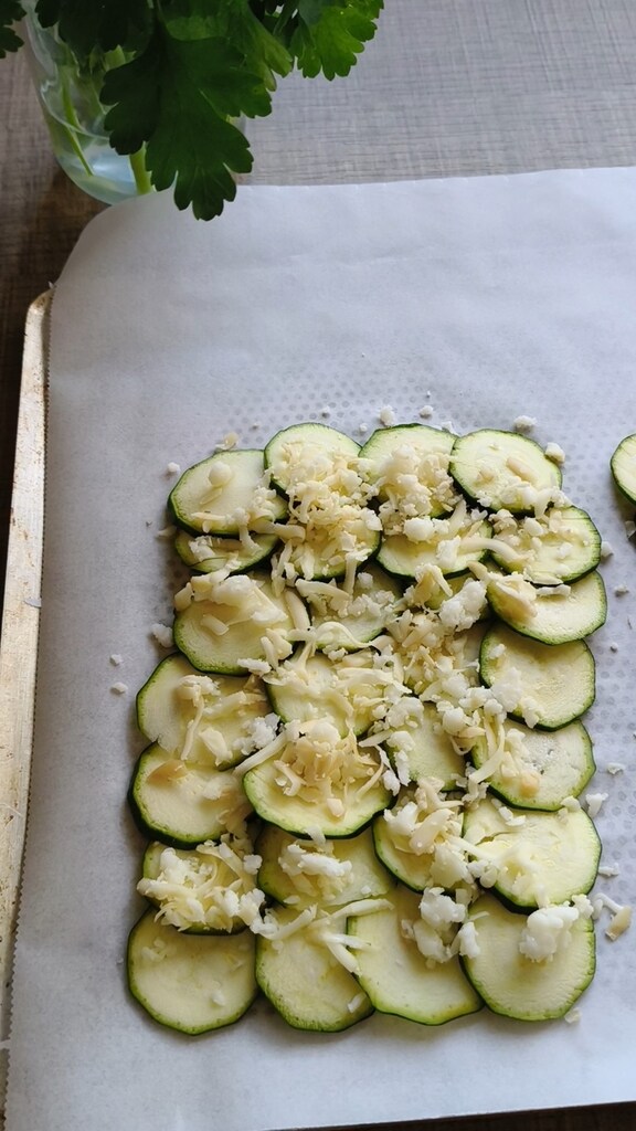 Die Zucchini waschen, trocknen und die Enden abschneiden. In dünne, aber nicht zu dünne Scheiben schneiden, sonst verbrennen sie beim Backen. Den Ofen auf 180°C vorheizen.