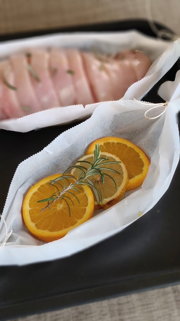 Die glasierte Hähnchenbrust mit Zitrusfrüchten, gewürzt mit Orangenscheiben und Zitrone und in einem praktischen Päckchen verpackt, ist eine perfekte Lösung für ein frisches und schmackhaftes Mittag- oder Abendessen. Mit wenigen Schritten und wenigen Zutaten erhält man ein leichtes und geschmackvolles Gericht, ideal auch für diejenigen, die wenig Zeit haben, aber nicht auf ein schmackhaftes und nahrhaftes Gericht verzichten wollen.