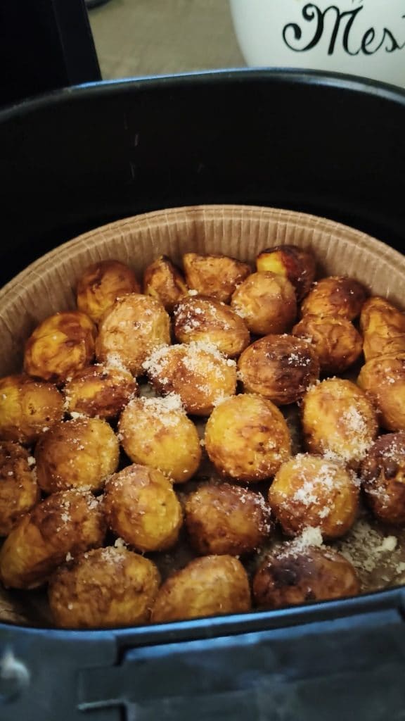 Die Heißluftfritteuse ist ideal für diese Art der Zubereitung: sie verkürzt die Garzeit, es ist nicht nötig, den Ofen vorzuheizen und die Kartoffeln sind leicht, aber gut gebräunt, dank des „glasierten“ Effekts, der durch den Honig entsteht.