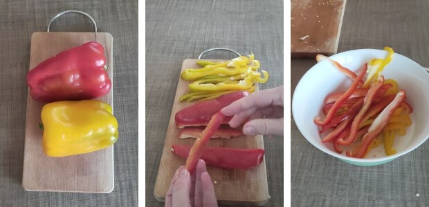 – Die Paprika waschen, in 2 Teile schneiden, die Kerne und die weißen Adern entfernen und in Streifen schneiden. In eine Schüssel geben.