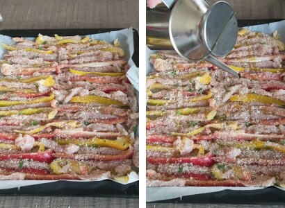 – Alles mit den restlichen Zutaten, die auf dem Boden der Schüssel geblieben sind, bestreuen und dann mit Öl beträufeln.