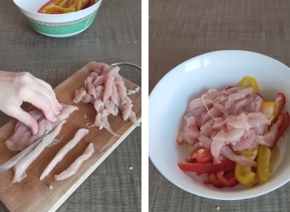 – Auch die Hähnchenbrust in Streifen schneiden und in dieselbe Schüssel wie die Paprika geben.