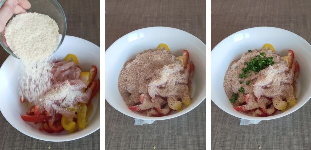 – Mit Parmesankäse, Semmelbrösel und vorher gewaschener, abgetrockneter und gehackter Petersilie würzen.