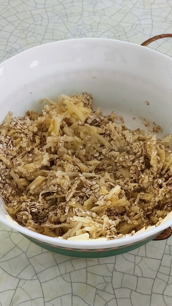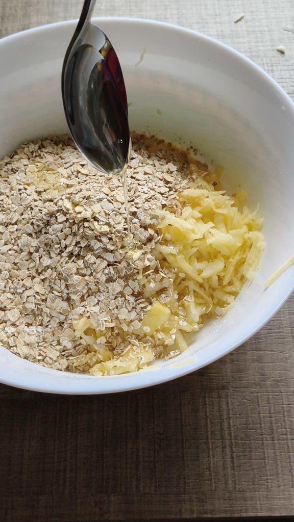 Tatsächlich müssen die Äpfel gerieben werden, und das ist die längste Arbeit; dann fügt man ungesüßte Vollkorn-Haferflocken, ein Ei, eine Prise Zimt und etwas Honig hinzu.
