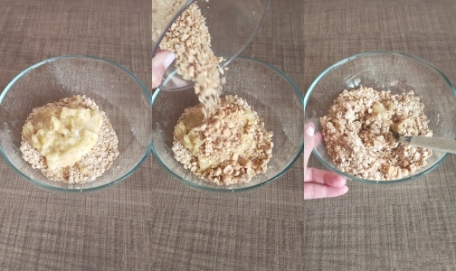 – Die Haferflocken in eine Schüssel geben, das Bananenmus hinzufügen, die gehackten Haselnüsse dazugeben und die Zutaten vermischen.