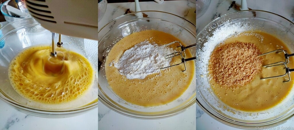 – Die Eier mit dem Zucker mit den elektrischen Schneebesen schlagen, bis eine helle und schaumige Masse entsteht; das mit dem Backpulver gesiebte Mehl hinzufügen und mit dem Spatel umrühren.