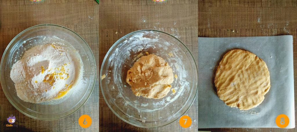 Den Teig schnell kneten, zu einem Laib formen (7), auf einem Backpapier oder in Frischhaltefolie ausrollen (8) und für mindestens 30 Minuten in den Kühlschrank stellen.
