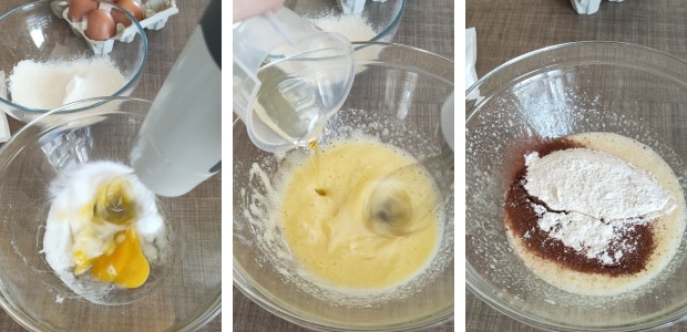 Das Ei mit dem Zucker mit einem elektrischen Mixer schlagen, dann das Öl und die bereits gesiebten Pulver hinzufügen.