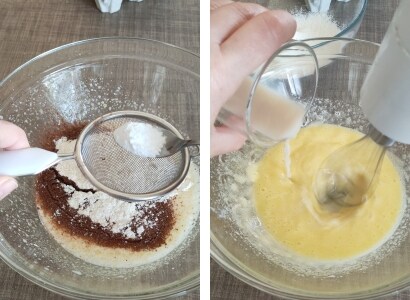 – Auch das Backpulver in die Schüssel sieben und dann die pflanzliche Milch langsam einfüllen.