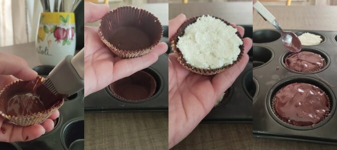 Auch hier sind die Hauptzutaten Joghurt, Kokosnuss und Schokolade … nur dass wir Spaß daran haben, die geschmolzene Schokolade auf die Papierförmchen zu streichen, die dann, wenn sie kalt ist, die perfekte essbare Hülle bilden!