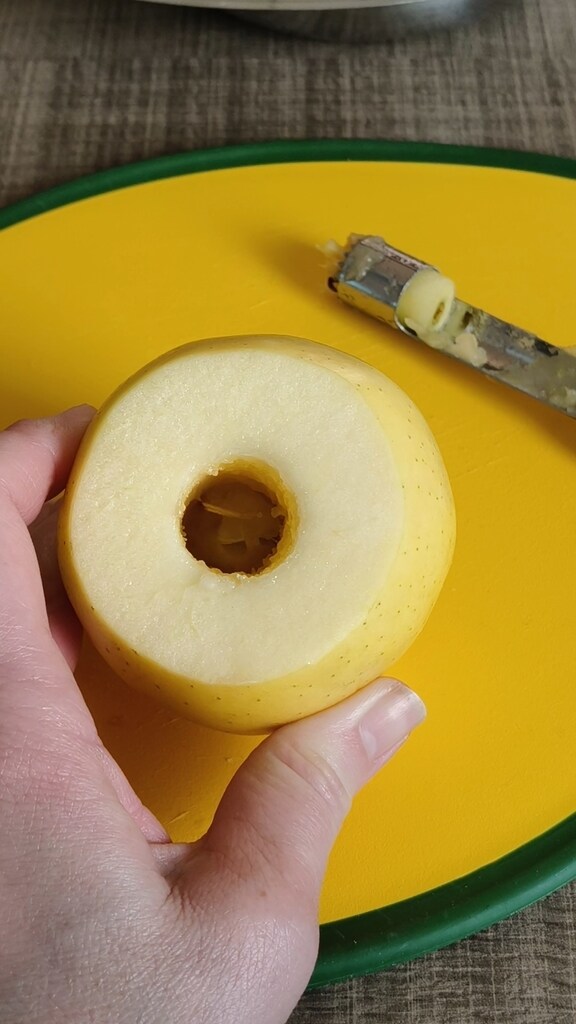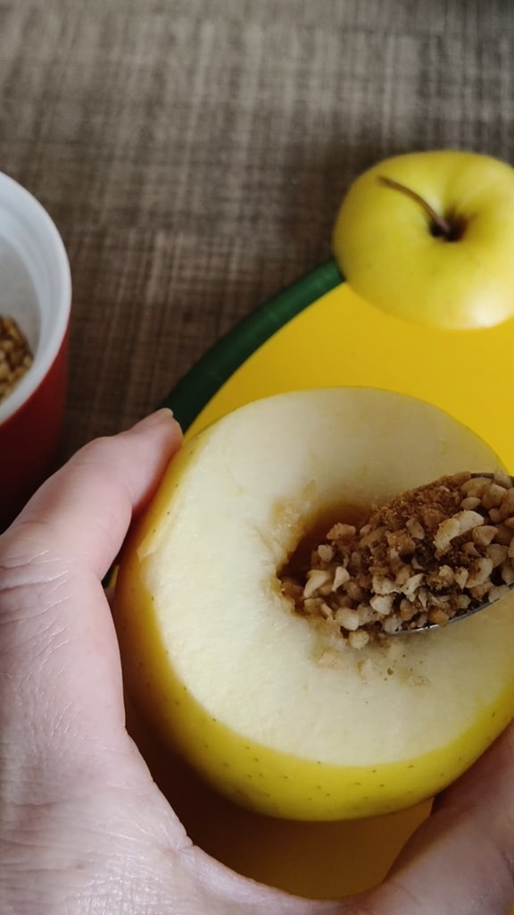 Mit dem Apfelausstecher die Äpfel aushöhlen, ohne bis zum Boden zu gehen, sonst läuft die Füllung heraus.