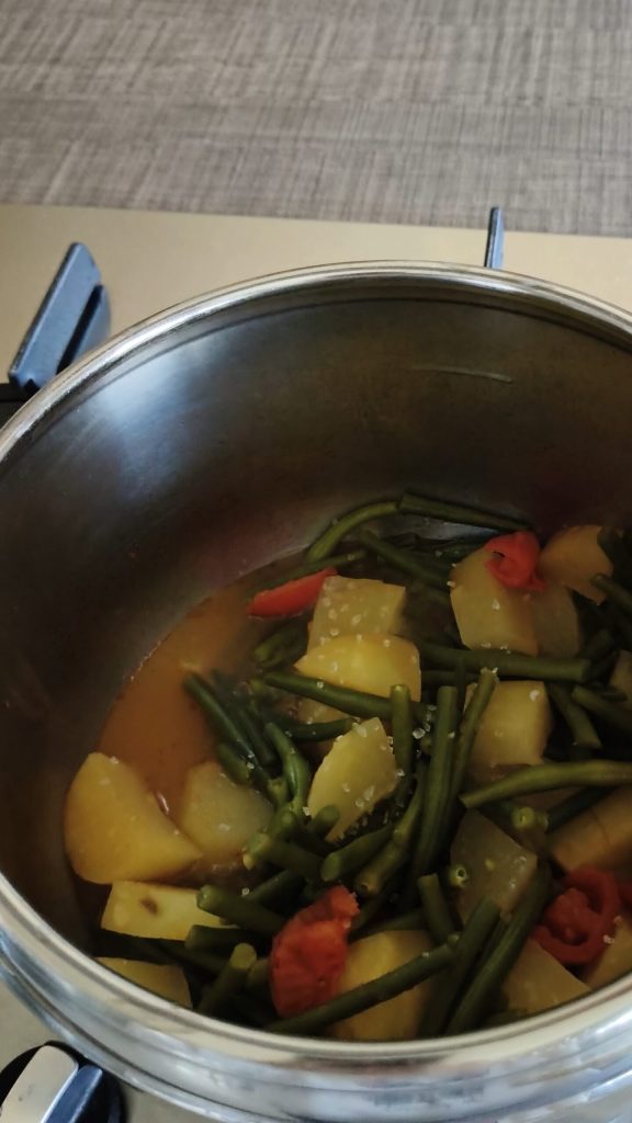 Das Rezept von Kartoffeln und grünen Bohnen im Schnellkochtopf hat mir meine Mutter beigebracht, die mittlerweile Oma ist und den Schnellkochtopf benutzte, als er noch eine „Neuheit“ in der Küche war. Es brauchte nur wenige Zutaten, immer dieselben: Kartoffeln, grüne Bohnen, Knoblauch, ein paar Tomaten und ein guter Schuss Olivenöl. Aber der Geschmack war besonders, und das ist er auch heute noch. Es zu kochen, bringt mich zurück in meine Kindheit, mit dem Duft, der aus dem zischenden Deckel entweicht.