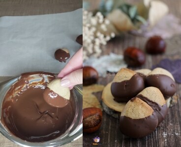 – Den Kastanienmürbeteig nehmen, Stücke von etwa 25 g abteilen und zuerst Kugeln formen, dann leicht flachdrücken und die Form einer Kastanie durch Kneifen der Enden geben. Auf ein mit Backpapier oder Silikonmatte ausgelegtes Backblech legen.