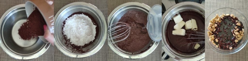 Bereiten Sie den Kakao-Sirup zu, indem Sie das Wasser mit der Butter und den vorher gesiebten Pulvern zum Kochen bringen, und rühren Sie 7/8 Minuten lang ständig um, bis er leicht dickflüssig wird.