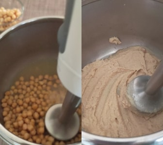 • – Die Kichererbsen direkt im Topf mit einem Stabmixer pürieren und gegebenenfalls prüfen, ob es nötig ist, etwas Wasser hinzuzufügen (falls das Püree zu dick sein sollte).