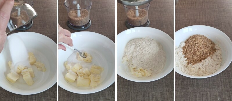 – Die weiche Butter und den Zucker in eine Schüssel geben; die Butter zerdrücken, um sie mit dem Zucker zu vermischen, dann das zuvor gesiebte Mehl, die Vanille und die gehackten Nüsse hinzufügen.