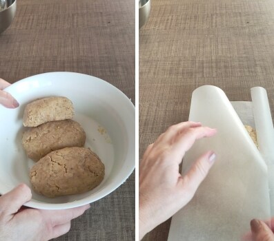 – Den Teig zusammenpressen (ich habe 3 kleine Stücke gemacht, weil ich nicht alles verwenden wollte) und den Teig in Backpapier eingewickelt für mindestens 2 Stunden in den Kühlschrank legen.