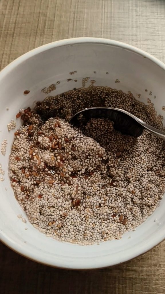 Leinsamen und Chia-Samen etwa 15 Minuten in Wasser einweichen; sie sollen das gesamte Wasser aufnehmen und gelartig werden.