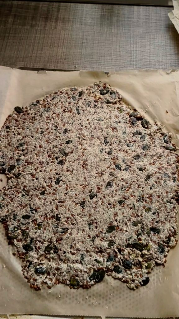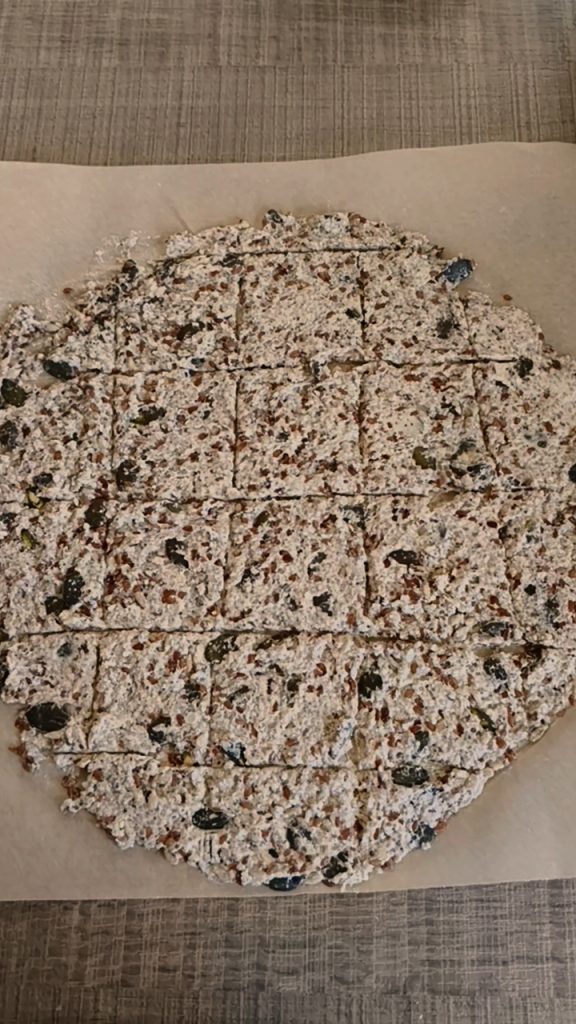 Das obere Backpapier vorsichtig abziehen und mit einem Messer waagerechte und senkrechte Linien einschneiden, um Quadrate oder Rechtecke zu erhalten. Im vorgeheizten Ofen bei 170°C Umluft ca. 18 Minuten backen oder bei Ober/Unterhitze 180°C etwa 20 Minuten. Nach Belieben kann man zur Hälfte der Backzeit die Oberfläche mit etwas Öl bestreichen und fertig backen. Nach dem Abkühlen entlang der Einschnitte brechen.