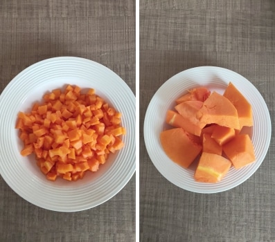 • – Schneiden Sie den Kürbis in kleine Würfel, sodass er in der erforderlichen Zeit kochen kann.