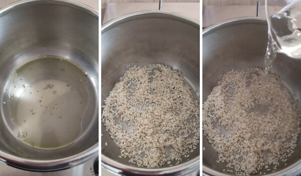 • – Braten Sie im Schnellkochtopf (ohne Deckel) das Öl mit der Zwiebel an (wenn Sie frische verwenden, hacken Sie sie), fügen Sie den Reis hinzu und rösten Sie ihn, bis er glasig wird. Dann mit 1/2 Glas Weißwein ablöschen.