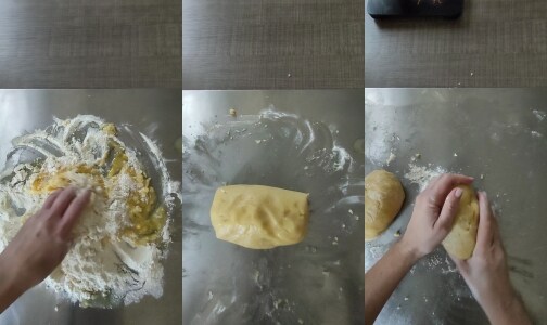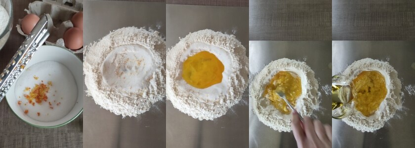 – Auf der Arbeitsfläche das Mehl mit dem Backpulver, Natron sieben, eine Mulde formen und in die Mitte den Zucker, die Eier, das Öl geben und wie einen normalen Mürbeteig kneten. (Da jedes Mehl eine unterschiedliche Flüssigkeitsaufnahme hat, könnte es passieren, dass der Teig weicher ist und daher das nötige Mehl hinzugefügt werden muss, um die richtige Konsistenz zu erreichen; umgekehrt könnte etwas Milch nötig sein, wenn der Teig beim Kneten zu hart ist) Da Öl verwendet wird, ist keine Ruhezeit im Kühlschrank nötig.