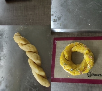 . Zwei Stränge à zwei Zöpfe formen und als Kranz rund schließen, indem die Enden leicht angedrückt werden.