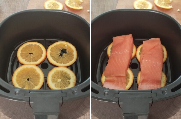 – Legen Sie die Orangenscheiben auf den Boden des Korbs der Heißluftfritteuse; legen Sie die gut abgetupften Lachsstücke darauf.