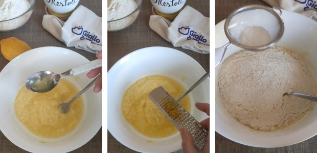 – Zum Teig den Limoncello und die Zitronenschale (zuerst gewaschen) hinzufügen. Den Teig mit Mehl und Backpulver beenden.