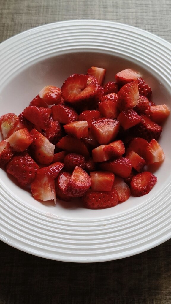 Erdbeeren waschen, trocken tupfen und in Stücke schneiden.