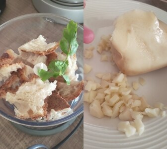 – In das Glas des Zerkleinerers das altbackene Brot mit der Petersilie geben und grob zerkleinern.
